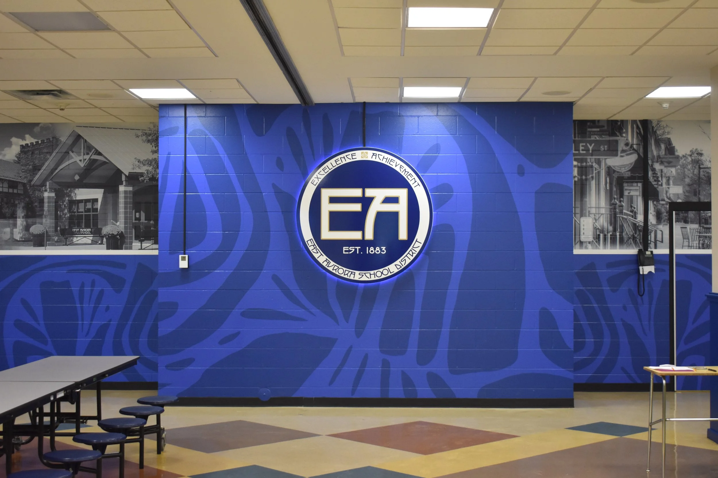 East Aurora CSD had a goal to revitalize their cafeteria with vibrant school colors, local photography, and a LED backlit logo, serving as a statement piece to the room.